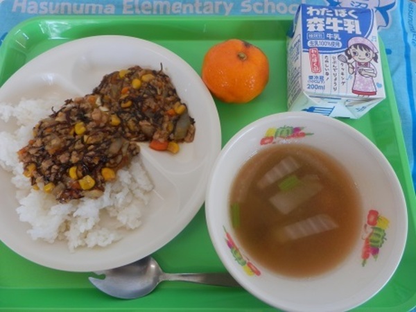 埼玉県産の食材は、牛乳、小松菜です。今日の給食は、人気のもずく丼です。もずくは、海に生息している海藻です。天然のもずくは、他の海藻(藻)に付着して生息しているので、「藻に付く」という意味で、もずくと呼ばれるようになったそうです。今日もゆっくり、よくかんで、おいしく召し上がれ♪※写真は中学年の盛付目安量です。