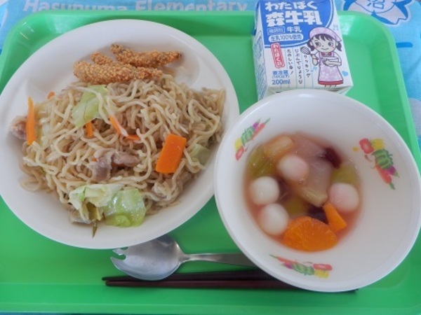 埼玉県産の食材は、牛乳、小松菜、根深ねぎです。今日は、キビナゴについてお話しをします。キビナゴは、頭から尻尾まで、丸ごと食べることができるので、魚のカルシウムを無駄なくとることができ、栄養面も大変優れています。日本は海に囲まれているため、魚を食べる食文化が発展し、昔からよく食べられていました。しかし、近年は日本人が魚を食べる量が減り、問題になっています。魚には、人間に必要な栄養素が多く含まれているので、積極的に食べましょう。今日もゆっくり、よくかんでおいしくめしあがれ♪※写真は中学年の盛付目安量です。
