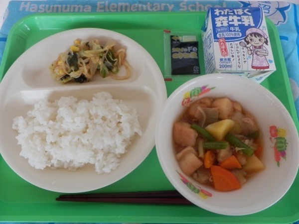 埼玉県産の食材は、牛乳、さいたま市大宮区こんにゃく屋さんのしらたきです。今日は、のり佃煮の佃煮について話をします。佃煮の名前の由来は、江戸時代に佃島、現在の東京都中央区の漁師さんが、海が荒れて魚が獲れないときに、保存の効くように工夫して、のりや小魚を甘辛く煮込んで非常用備蓄食にしたのが始まりとされています。今日もゆっくり、よくかんで、おいしく召し上がれ♪※写真は中学年の盛付目安量です。