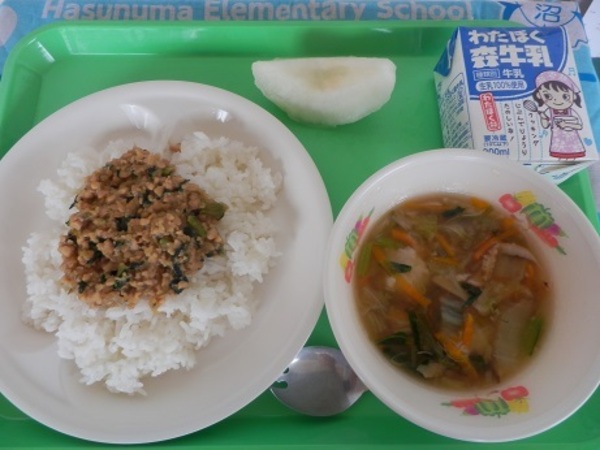 埼玉県産の食材は、牛乳、小松菜、梨です。旬の食材は、梨です。今日は、旬の梨について話をします。梨は、埼玉県の特産品です。日本では、果物の中で古くから作られており、1,300年前の本にも書き記されています。埼玉県の梨生産量は、令和6年度全国第9位で、久喜市や白岡市、蓮田市などで多く栽培されています。今日の梨は、「彩玉」という種類です。埼玉県で生まれた梨です。彩玉は、ジューシーで甘みが強いのが特徴です。今日もゆっくり、よくかんで、おいしく召し上がれ♪※写真は中学年の盛付目安量です。