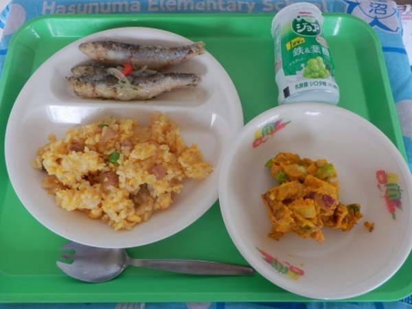 埼玉県産の食材は、牛乳です。旬の食材は、いわし、かぼちゃです。今日は、旬の「いわし」について話をします。いわしは、6月~10月頃が旬の魚です。この時期のいわしは、脂がのっていて、おいしいとされています。マイワシは、昔はたくさん獲れましたが、近年では獲れなくなっています。今日もゆっくり、よくかんで、おいしく召し上がれ♪