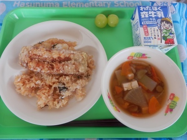 埼玉県産の食材は、牛乳、さいたま市見沼区お豆腐屋さんの豆腐、大宮区こんにゃく屋さんのこんにゃくです。旬の食材は、さんま、ぶどうです。