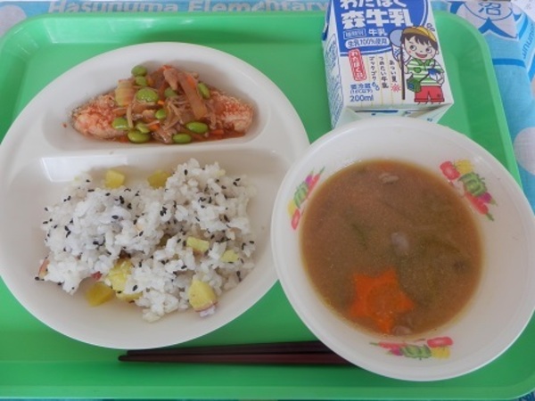 今日は、お魚の日です。旬のサケとさつま芋を紹介します。サケは、味の良いことと、身の色や形がきれいなことから、世界中で親しまれている魚です。一般的に「天然もの」より「養殖もの」の方が脂肪を多く含み、サンマやイワシについで、EPAやDHAという栄養素がたくさん含まれています。ご飯には、ビタミンB群という栄養素が少ないので、ご飯と組み合わせて「サケ」を食べることは、栄養的にもバランスの良い食べ方といえます。さつま芋は、シルクスイートという品種で、シルクのような滑らかな舌触りが特徴です。今日もゆっくり、よくかんで、おいしく召し上がれ♪※写真は中学年の盛付目安量です。