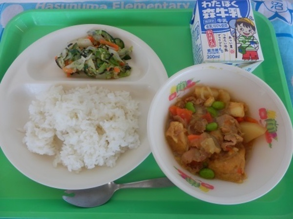 今日の給食は、じゃが芋についてお話しします。じゃが芋は、日本には1,600年頃に現在のインドネシアのジャカルタから長崎に伝わりました。最初はじゃがたら芋、やがてじゃが芋と呼ばれるようになりました。ビタミンCやカリウムが多く、日本では野菜として扱われますが、世界では、米、小麦、とうもろこしと並ぶ主要作物で、エネルギー源としての役割を果たしています。今日もゆっくり、よくかんで、おいしく召し上がれ♪※写真は中学年の盛付目安量です。
