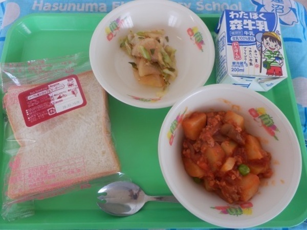 埼玉県産の食材は、牛乳、小麦粉です。今日は食品の選択についてのお話しです。じゃが芋は、男爵という種類のじゃが芋を使って作っています。男爵は、1906年北海道の農場主がアメリカから輸入し、日本で栽培されるようになったそうです。この農場の主が、川田りょうきちさんで、男爵という地位だったので、「男爵いも」という名前がついたそうです。今日もゆっくり、よくかんで、おいしく召し上がれ♪※写真は中学年の盛付目安量です。