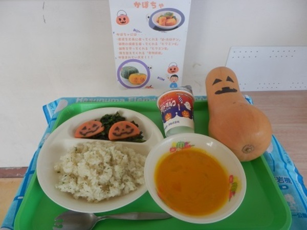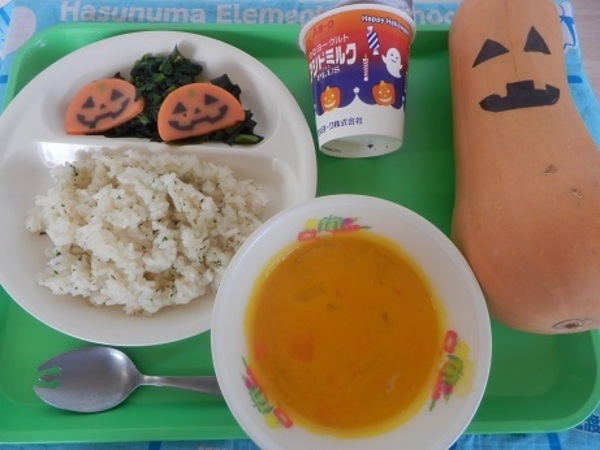10月31日はハロウィンです。その日は2年生が校外学習のため、少し早いですが、今日はハロウィン給食です。そして、今月は、蓮沼小学校読書月間です。「14ひきのかぼちゃ」に登場する「かぼちゃ」を使った給食を作りました。かぼちゃは、さいたまヨーロッパ野菜・旬の「バターナッツかぼちゃ」を使いました。バターナッツかぼちゃの旬は、9月から11月頃です。特徴は、甘みが強く、ナッツのような風味がするので、バターナッツかぼちゃという名前がついたそうです。食感は、ねっとりとして、なめらかなので、ポタージュやグラタンに向いています。今日もゆっくり、よくかんで、おいしく召し上がれ♪※写真は中学年の盛付目安量です。