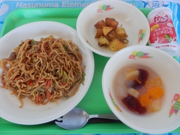 今日の給食は、はす小フェスティバルにちなみ「屋台風給食」です。そして、2年生のお友だちがみなさんに紹介したい料理「コンソメポテト」を作りました。今日もゆっくり、よくかんで、おいしく召し上がれ♪※写真は中学年の盛付目安量です。