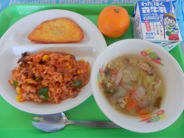 埼玉県産の食材は、牛乳、白菜、さいたま市岩槻区のお米です。旬の食材は、白菜、みかんです。今日は2年生、4年生、6年生のお友だちがみなさんに紹介したい料理「オムライス」です。給食室では、セルフオムライスとして、チキンライスとトマトソースが入ったオムレツを用意しました。今日もゆっくり、よくかんで、おいしく召し上がれ♪※写真は中学年の盛付目安量です。