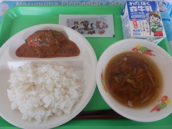 最後にお知らせです。味付けのりのイラストは、蓮沼小学校ファンタジーバンド応援のりです。ファンタジーバンドは、先月、大阪で行われた第44回全日本小学生バンドフェスティバル・フロア部門において、銀賞を受賞しました。そして、今週、6日(土)は、さいたまスーパーアリーナで、マーチングバンド全国大会があります。素敵な演奏を期待しています。今日もゆっくり、よくかんで、おいしく召し上がれ♪※写真は中学年の盛付目安量です。