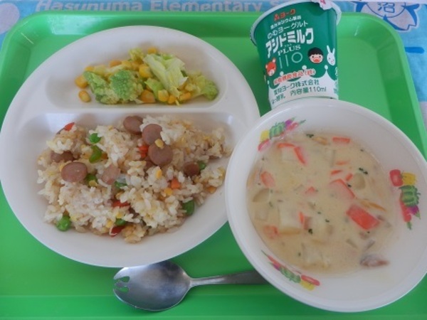 埼玉県産の食材は、米、牛乳、さいたま市岩槻区ヨーロッパ野菜研究会が育てたロマネスコです。旬の食材はロマネスコです。蓮沼小学校学校給食週間最終日の今日は現在の給食です。さいたま市と友好姉妹都市を結んでいるカナダナナイモ市があるカナダ風の料理とさいたまヨーロッパ野菜のロマネスコを使用したサラダを作りました。