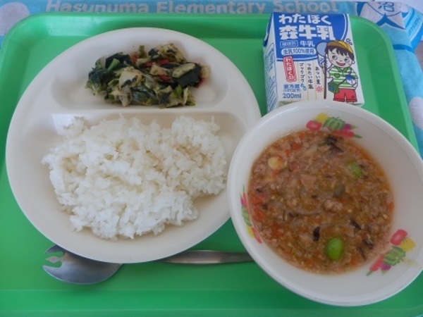 埼玉県産の食材は、牛乳、豆腐、小松菜です。今日は、食品の選択についてお話しします。「チョレギサラダ」は、名前は聞いたことがあっても、「どんなサラダなのかな」と思った人もいるかもしれませんね。チョレギサラダは、韓国で食べられているサラダがもとになっています。「チョレギ」という言葉には、「あえもの」や「浅づけ」という意味があります。 つまり、野菜をシャキシャキのまま、特別なドレッシングでさっとあえたサラダです。このサラダのポイントは、ごま油の香りと塩味のきいたドレッシングです。 にんにくの風味が少し加わることで、野菜がとてもおいしく感じられます。 レタスやきゅうりなどの野菜に、白ごまや海苔をちらすこともあります。 香ばしい香りがして、食欲がわいてきます。日本では焼肉屋さんでも人気のメニューで、 「さっぱりしているのに、しっかり味がある」と大人にも子どもにも好まれています。今日の給食のチョレギサラダも、野菜をおいしく食べてもらえるように工夫しています。今日もゆっくり、よくかんで、おいしく召し上がれ♪※写真は中学年の盛付目安量です。